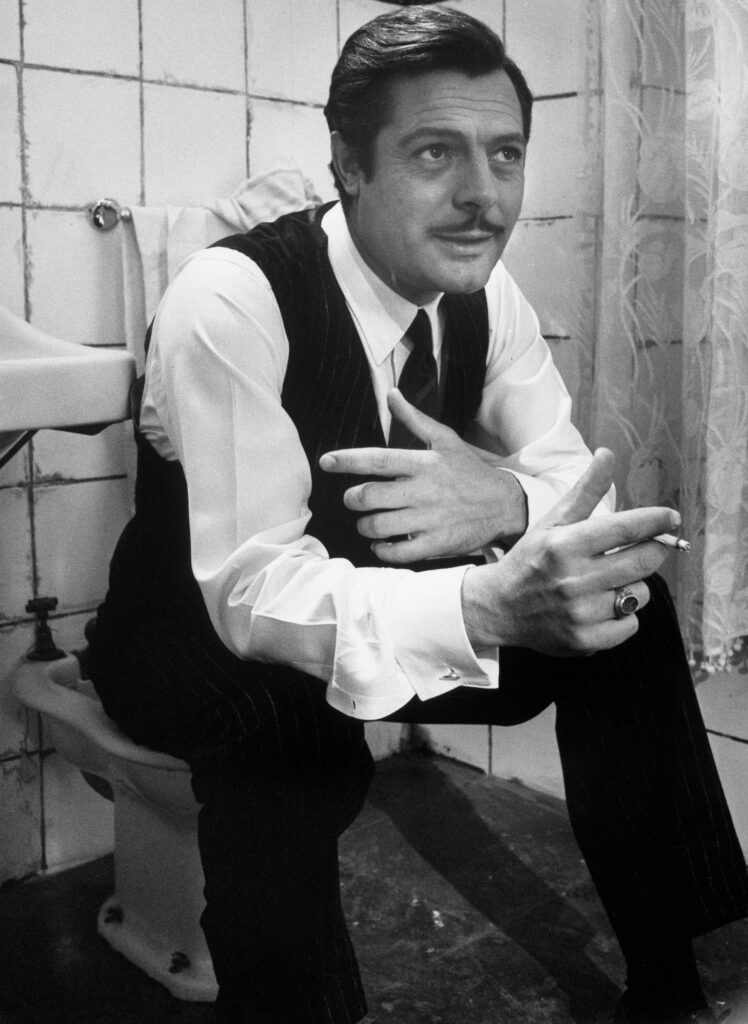The other popular photo from this shoot is one of Mastroianni, and its appeal is more of the cheeky variety. The photo shows the debonair actor in an unlikely pose— sitting on a bidet, smoking a cigarette.